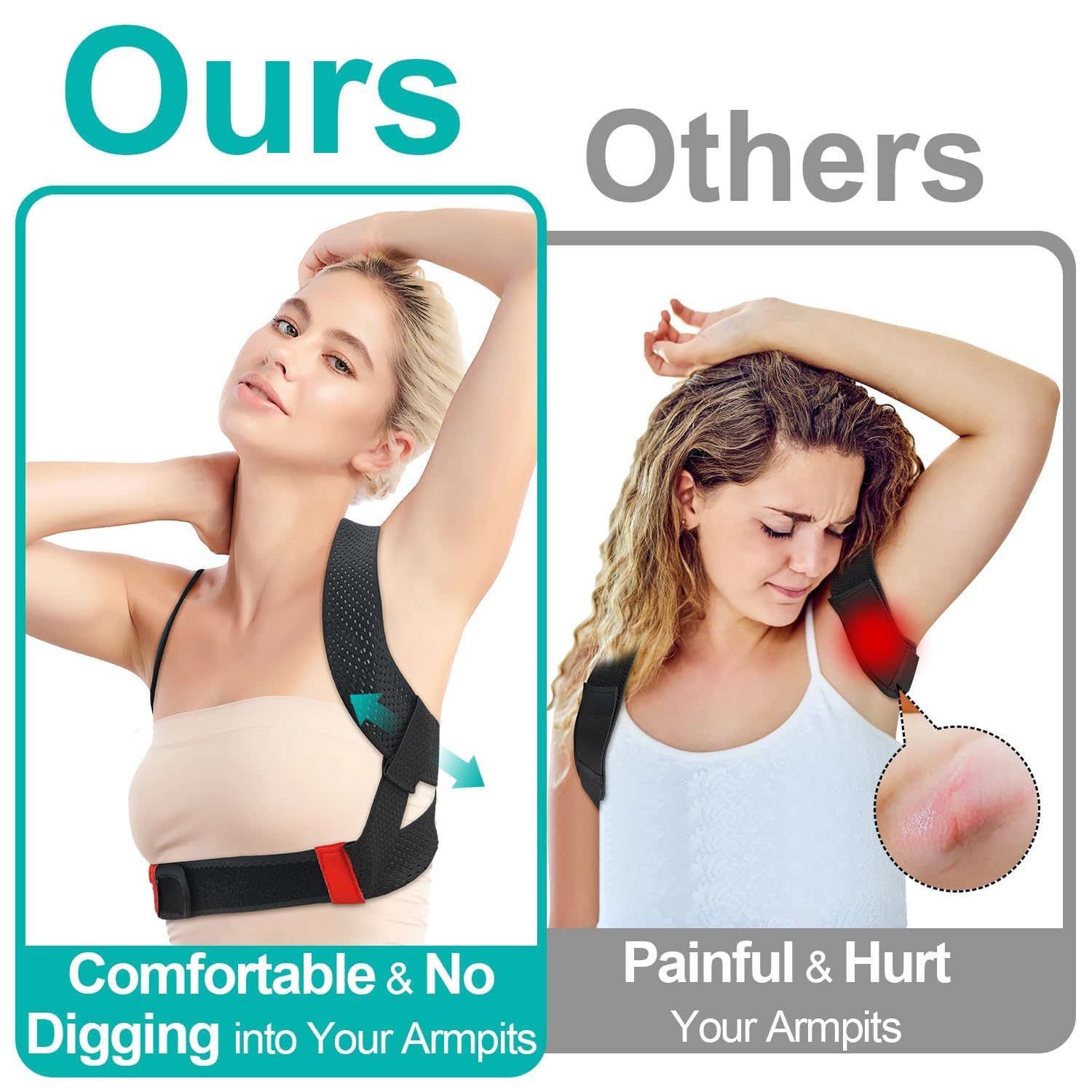 - No More Pinching: One of the biggest complaints about back brace for posture for women is how they dig into the armpits. We fixed that. Our adjustable straps let you customize the fit so it feels just right—no pinching, rubbing, or awkward discomfort. Plus, unlike older upper back brace that put pressure on your neck, our back posture corrector keeps your neck free and comfortable, focusing support exactly where it’s needed.